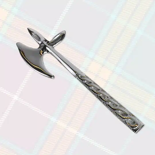 This is a battle axe kilt pin with Celtic knotwork on the handle. Made from highly polished, silver-tone steel, it measures three inches long.