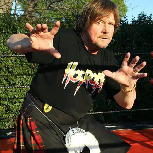 We did a photoshoot with Rowdy Roddy Piper and “Mean” Gene Okerlund in a backyard wrestling ring in Simi Valley. Seeing Roddy put on the Sport Kilt we made for him was surreal. He was actually super quiet and soft-spoken until the cameras started rolling, at which point his Rowdy alter ego was fully activated and he taunted me the whole time from the mat. It was a blast. When I asked him why he wears a black kilt, he said with a straight face, “because all my friends are dead.” We were saddened to learn of his too-soon passing in 2015. RIP Roddy!