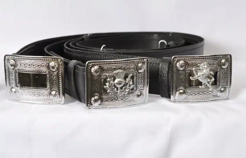 a 2 1/2″ wide kilt belt, with your choice of either Rampant Lion, Scottish Thistle, or Celtic Knot belt buckle.