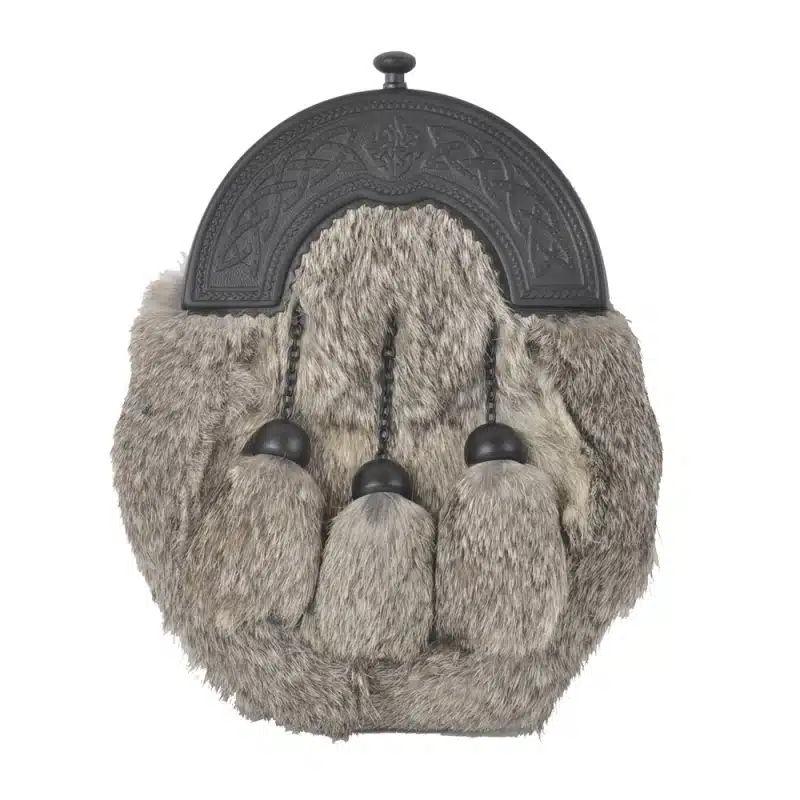 One of our favorite sporrans we carry, The Black Matte and Gray sporran is a modern classic. The picture really doesn’t do it justice. Similar to our gray rabbit sporran, except the top cantle, tassels, and sporran chain has been powder coated in a matte black finish. A slightly modern twist to a formal sporran style, sure to look great with any kilt you put it on over. Functional as well with a snap opening on the back. This sporran like most others accordions out to accommodate your wallet, keys, phone, and anything else in your everyday carry.