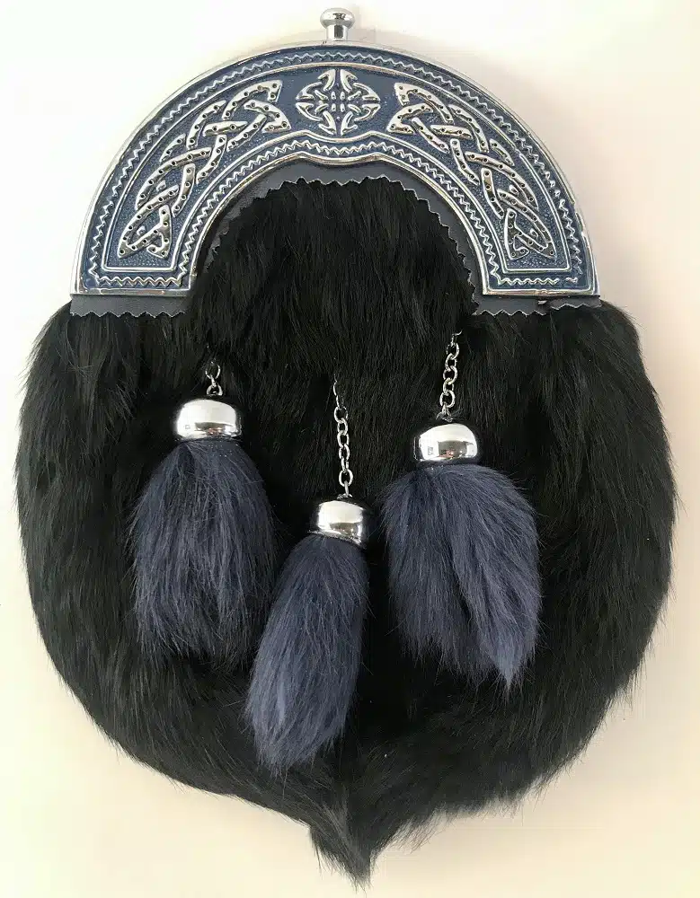 A dress sporan with blue highlights enameled in the metal cantle. Also features matching blue tassels. Comes with deluxe sporran chain.