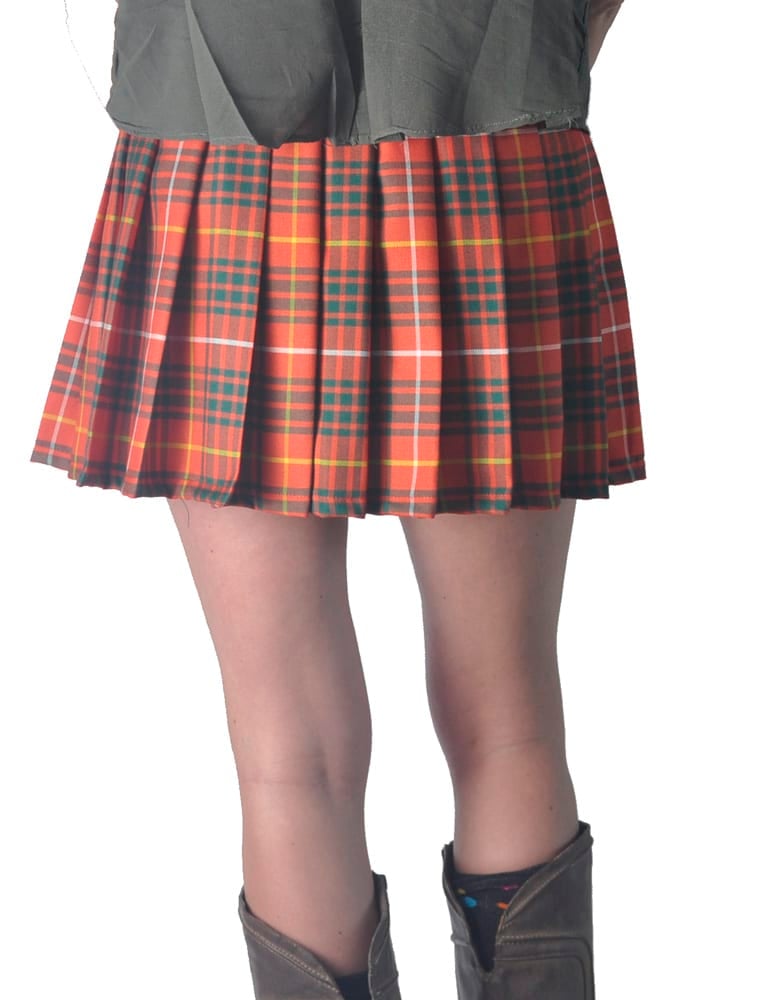 The Bruce tartan mini kilt. The Bruce Ancient tartan features faded red turned orange, with forest green and intersecting stripes of yellow and white.