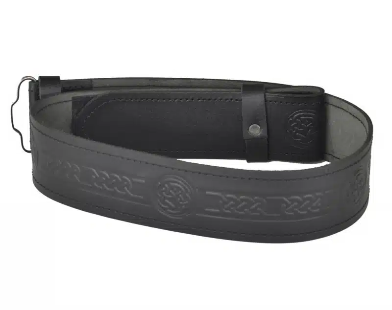 A leather kilt belt with Celtic Knotwork embossing. Each size is adjustable 4-6″ in either direction with a velcro tab.