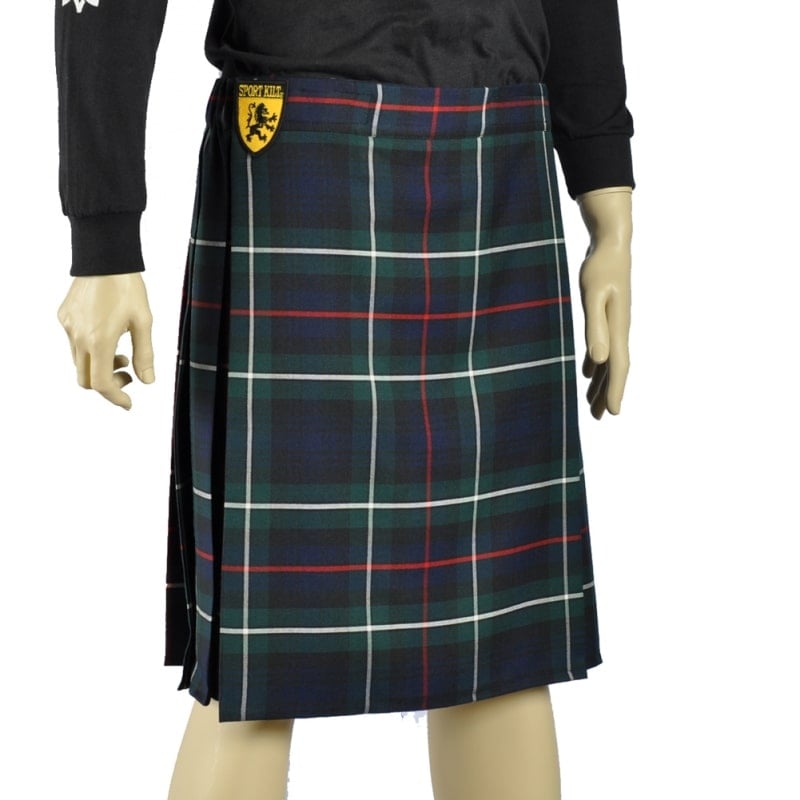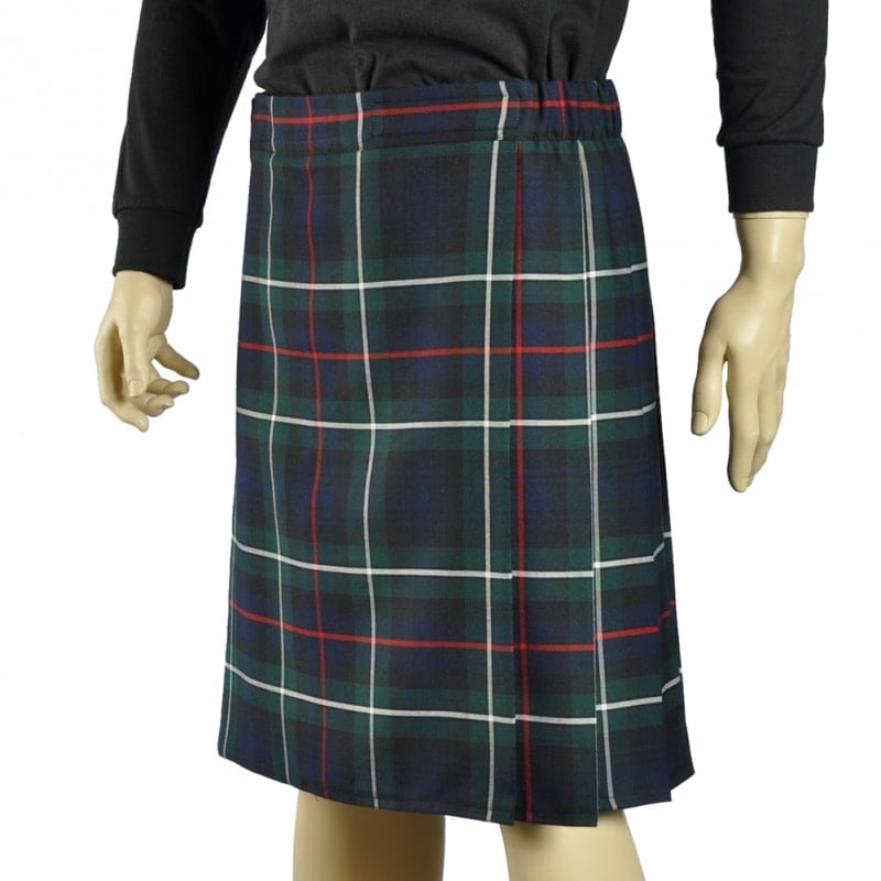 A kilt of rich green and blue with white and red pinstripes.