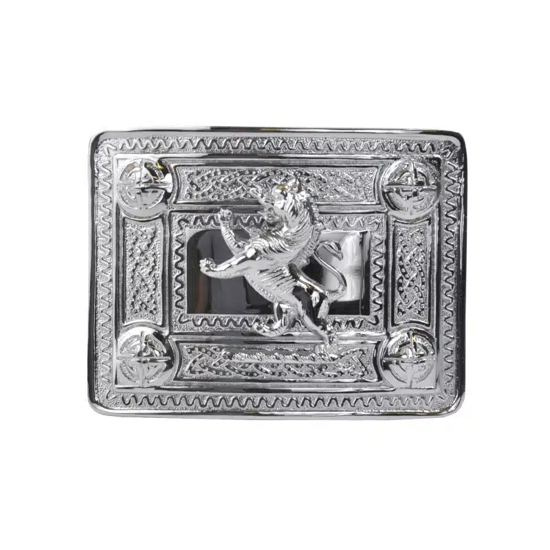 Kilt Belt Buckle with Rampant Lion on a Celtic knot background in a bright Chrome finish.