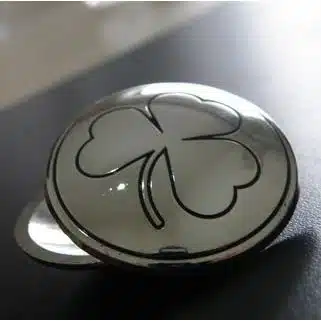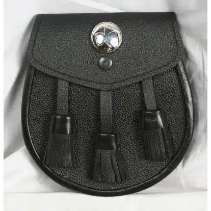 This black leather Day Sporran is adorned with a chrome-bright shamrock, denoting your Celtic heritage.