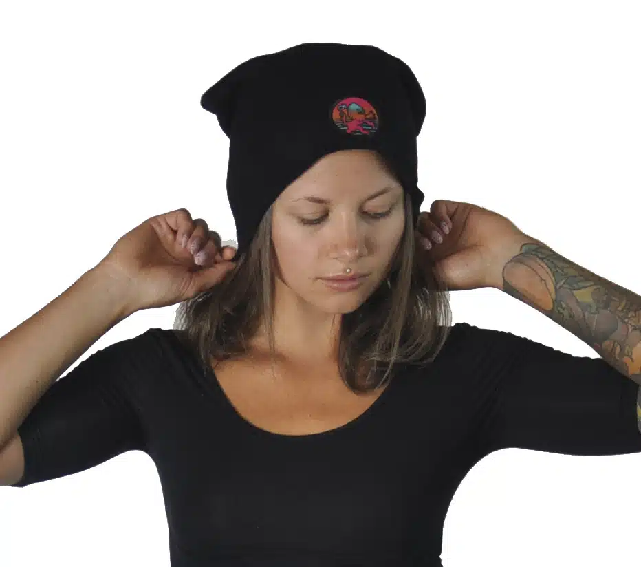 When you don’t want to get out of bed or comb your hear, you can wear this thin slacker beanie all day. With plenty of room in the back to ruck in your long hair or dreadlocks, this will have you ready for your breakfast bowl in no time.  Black, Unisex, and roomy. You can wear the patch in the front, on the side, in the back, or anywhere in between.