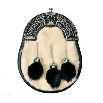 A beautiful dress sporran with soft, white rabbit fur, an antiqued silver metal opening, and three decorative, black, metal-topped rabbit tassels.