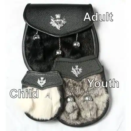 Ideal for kids from 2-8 years old. Pictured at left are three sizes: Adult, Youth, and child size sporrans. The youth size measures 5.5" wide by 6.5" tall. Available in white, gray or black rabbit fur.